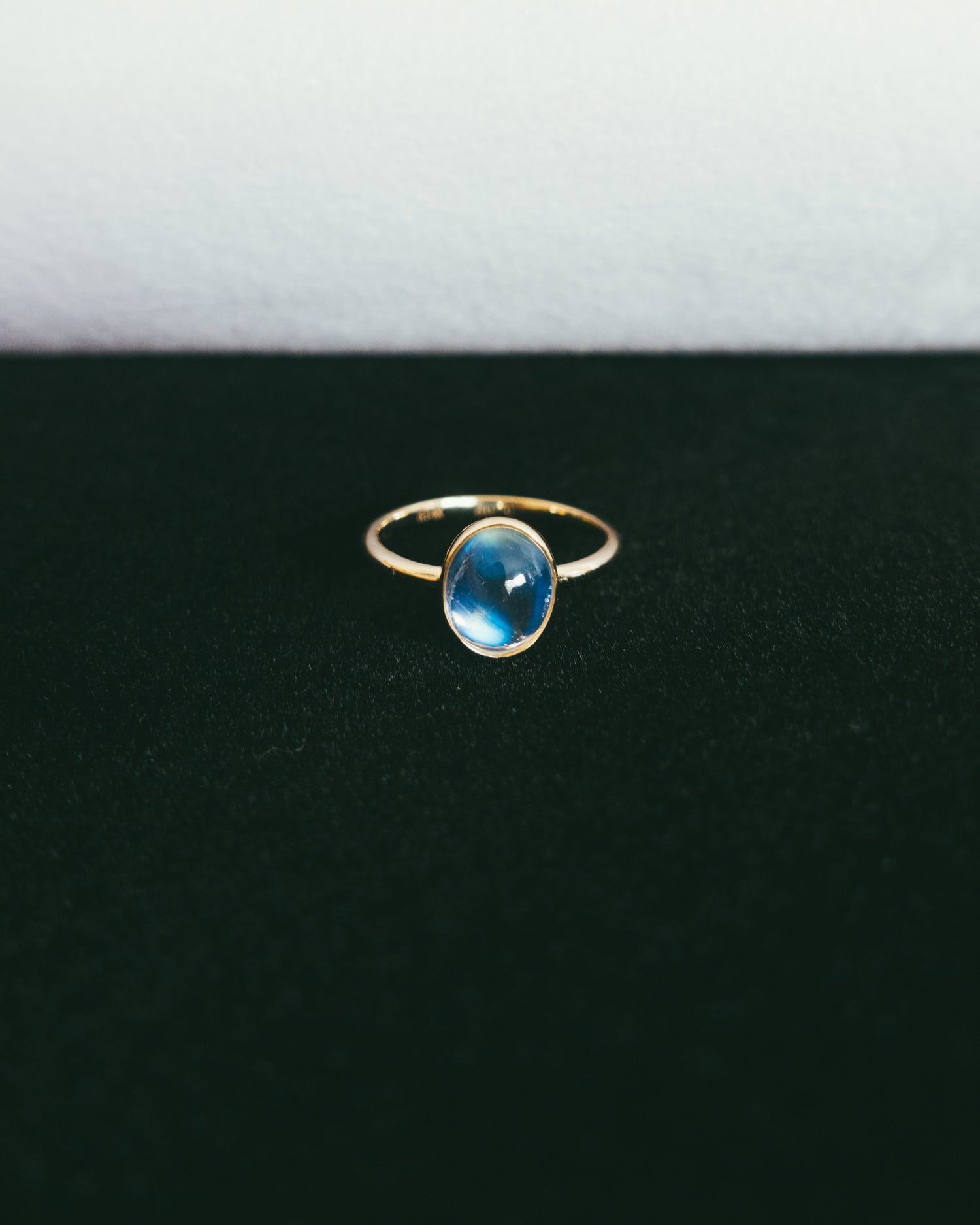 This one-of-a-kind ring is crafted in solid 14k yellow gold and set with an oval, domed blue moonstone chosen for its depth, glow, and natural character. The stone’s luminous surface is framed by a clean, minimal setting, allowing its shifting blue tones to take centre stage.