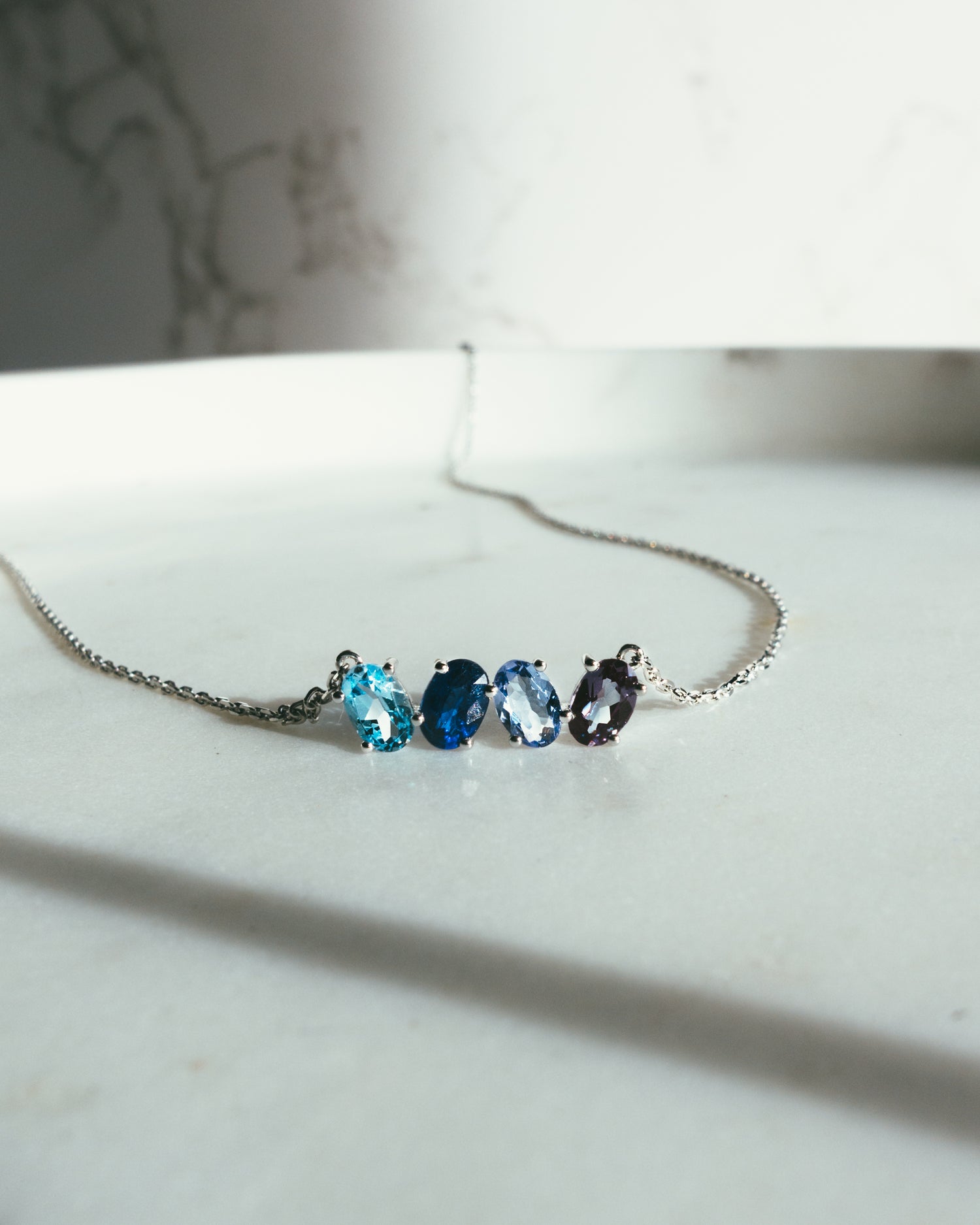 Crafted in solid 18k white gold, this custom necklace features a curated sequence of aquamarine, blue sapphire, tanzanite, and alexandrite—each gemstone chosen to represent a meaningful month. Set in a clean, linear composition, the design allows the natural colours and character of each stone to speak with clarity and balance.