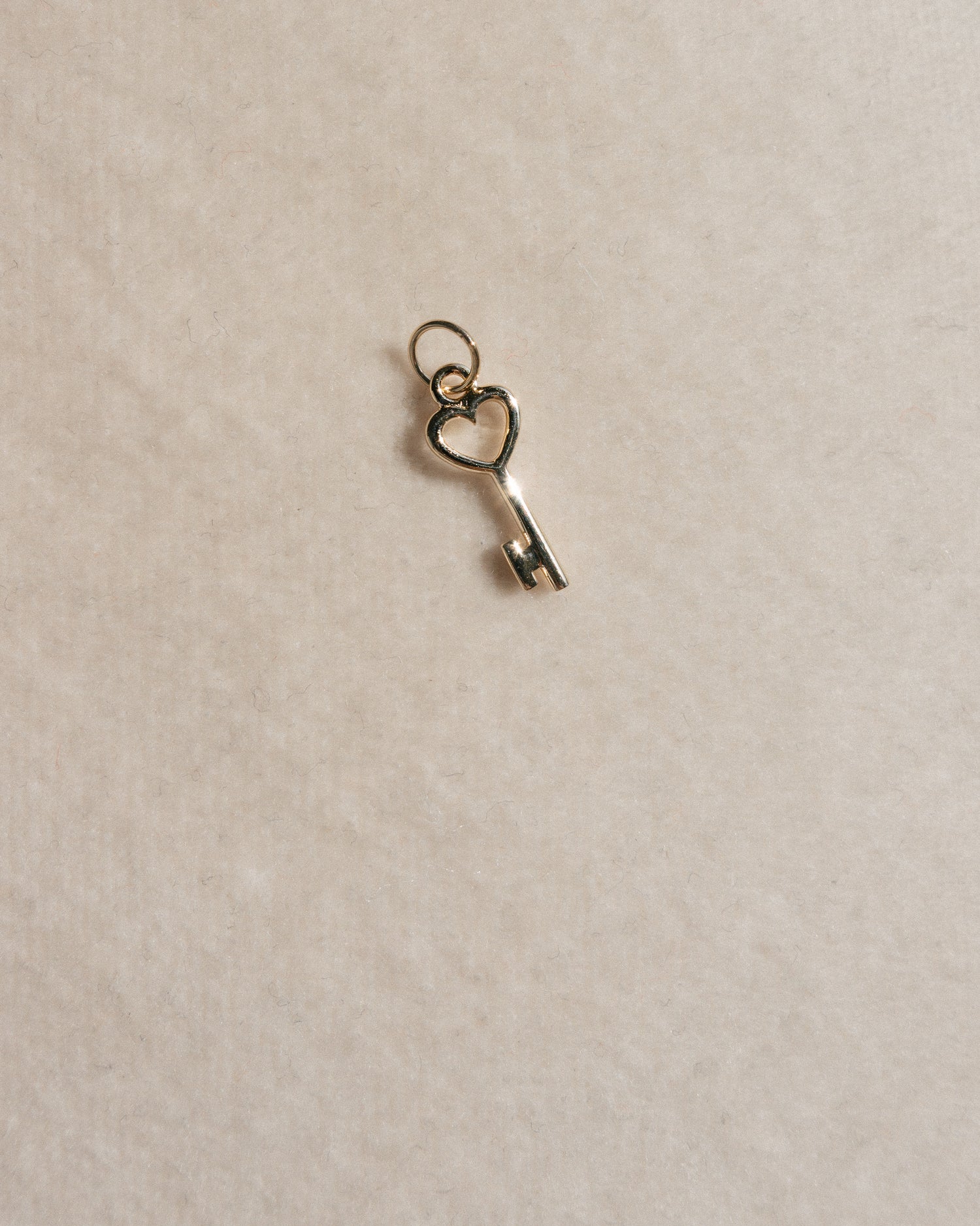 This delicate charm was custom designed as a key to the heart—created for a client drawn to the timeless shape of love and the beauty of subtle detail. Crafted in solid 14k yellow gold, the pendant features a softly sculpted heart paired with a slender key form, refined and minimal in scale.