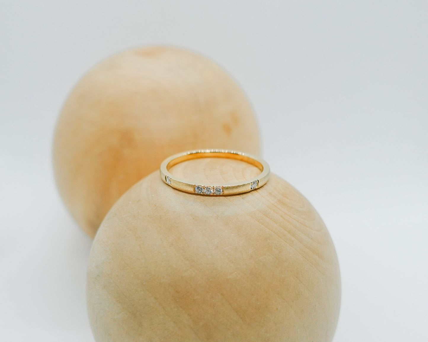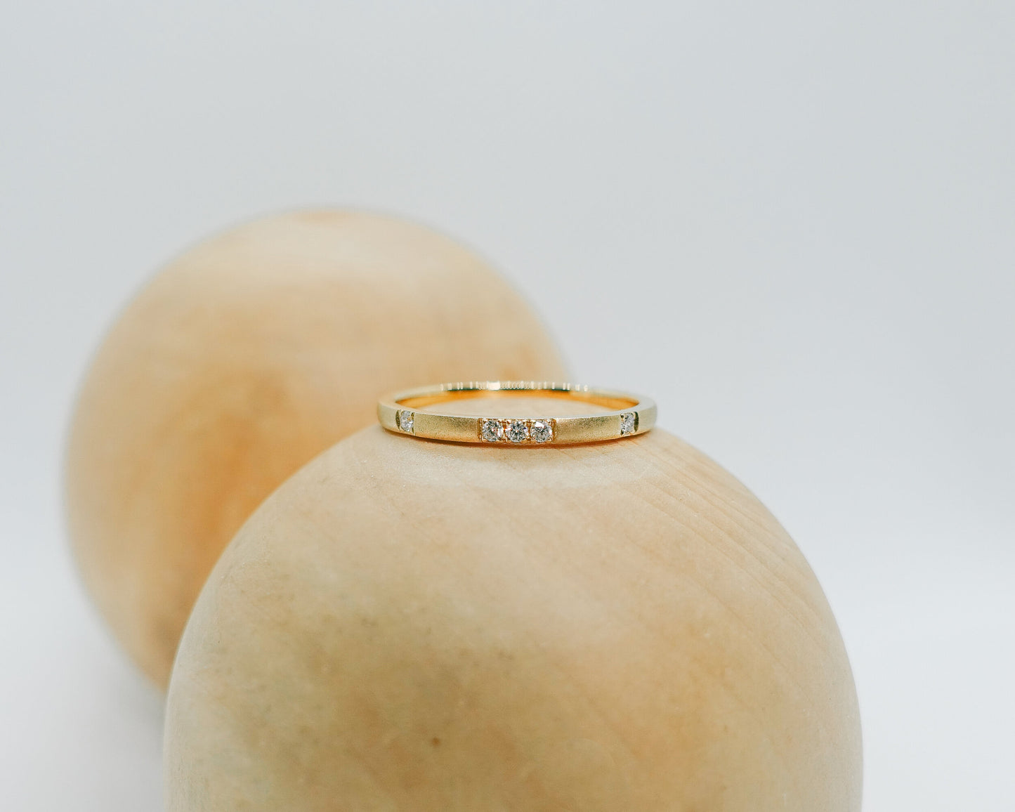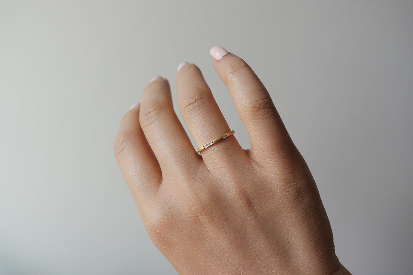 Handcrafted from matte finished 18k gold, this delicate, stackable band twinkles with five faceted diamonds.